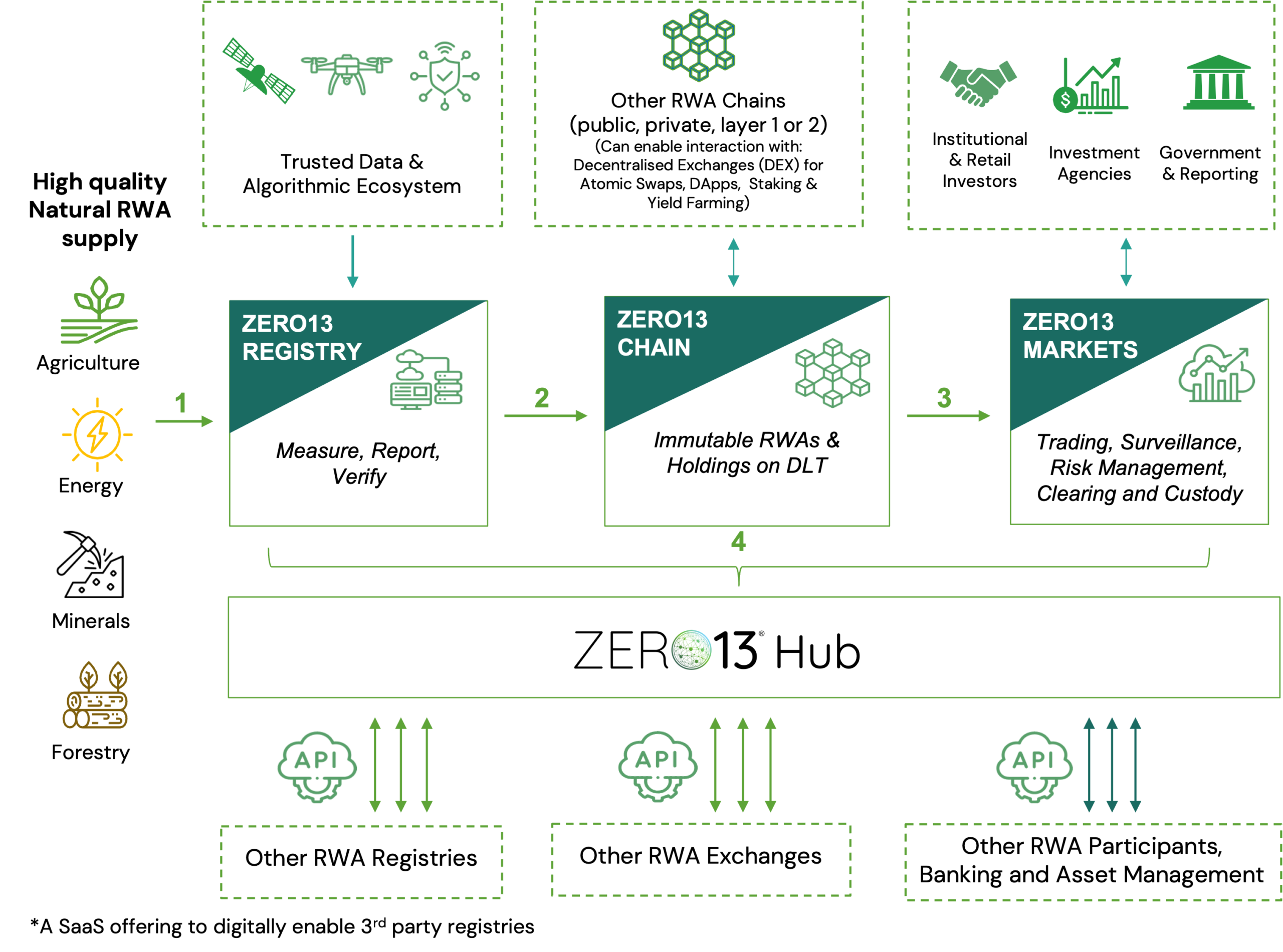 ZERO13 operates a distributed hub-and-spoke network that connects sovereign and private green RWAs to an investment and trading platform, with an asset settlement layer linking registries, custodians, investors and traditional/digital markets.